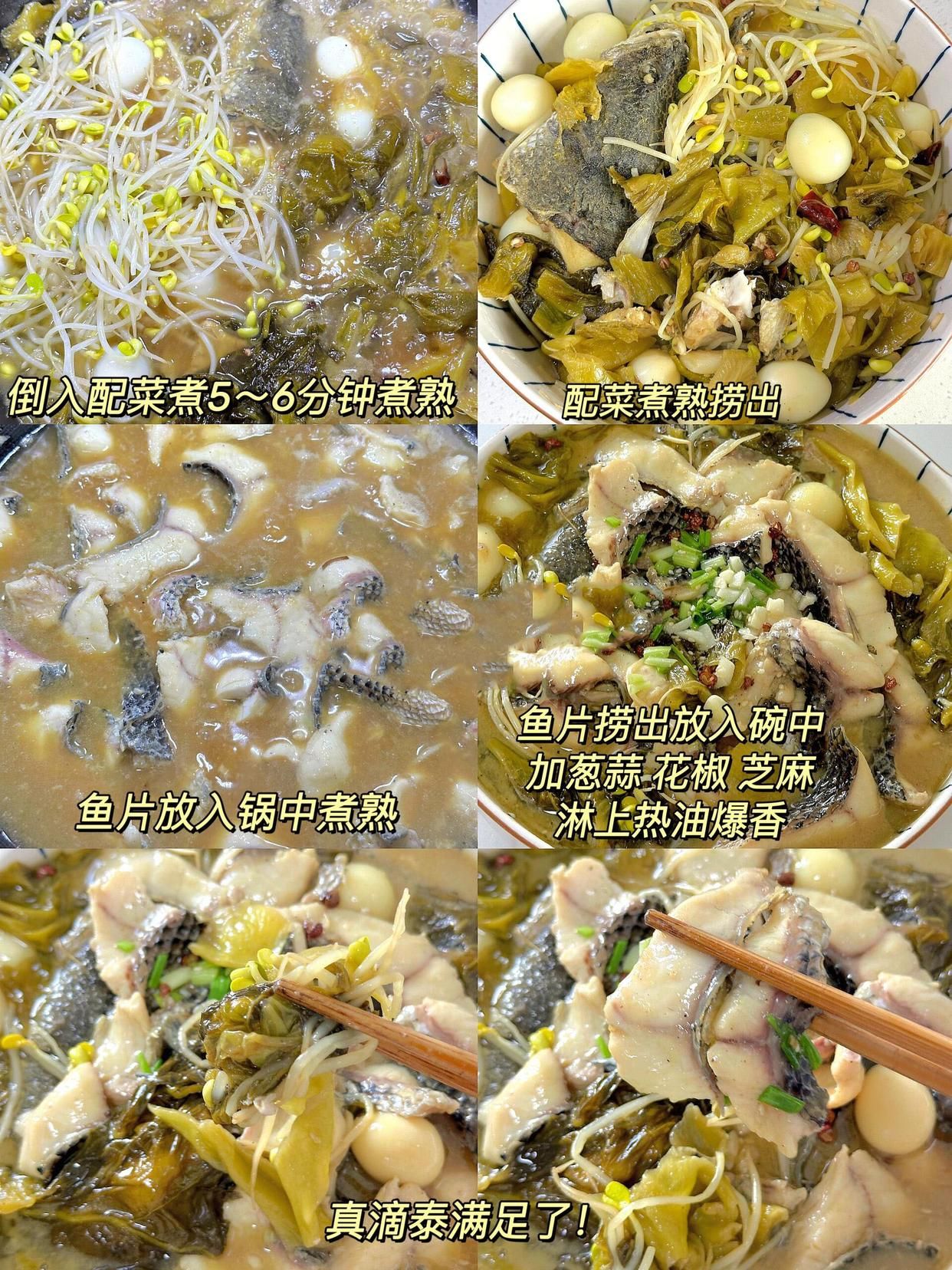 湯煮好后用漏勺撈出所有固體(魚骨、酸菜等),鋪在大碗底部當"打底天團"。接著放入豆芽和剝殼的鵪鶉蛋,煮3分鐘后撈出鋪在酸菜上。保持湯面微沸狀態,把腌好的魚片一片片展開下鍋,全部下完后等10秒再用筷子輕輕撥散,煮1分30秒立即關火(魚片變白卷曲就趕緊撈,煮太久會碎!)。