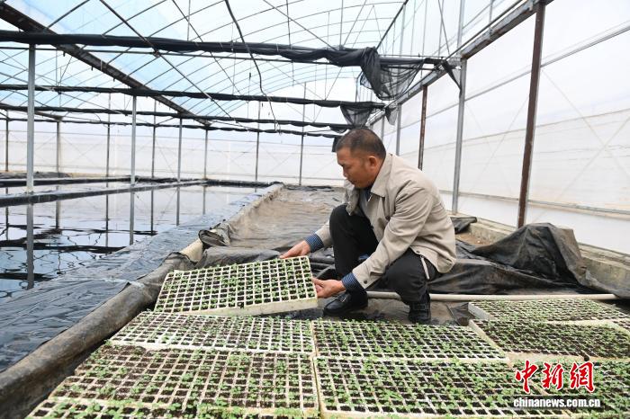 圖為廖其智在蔬菜大棚里察看新試種的菜苗。中新網記者 蔣雪林 攝