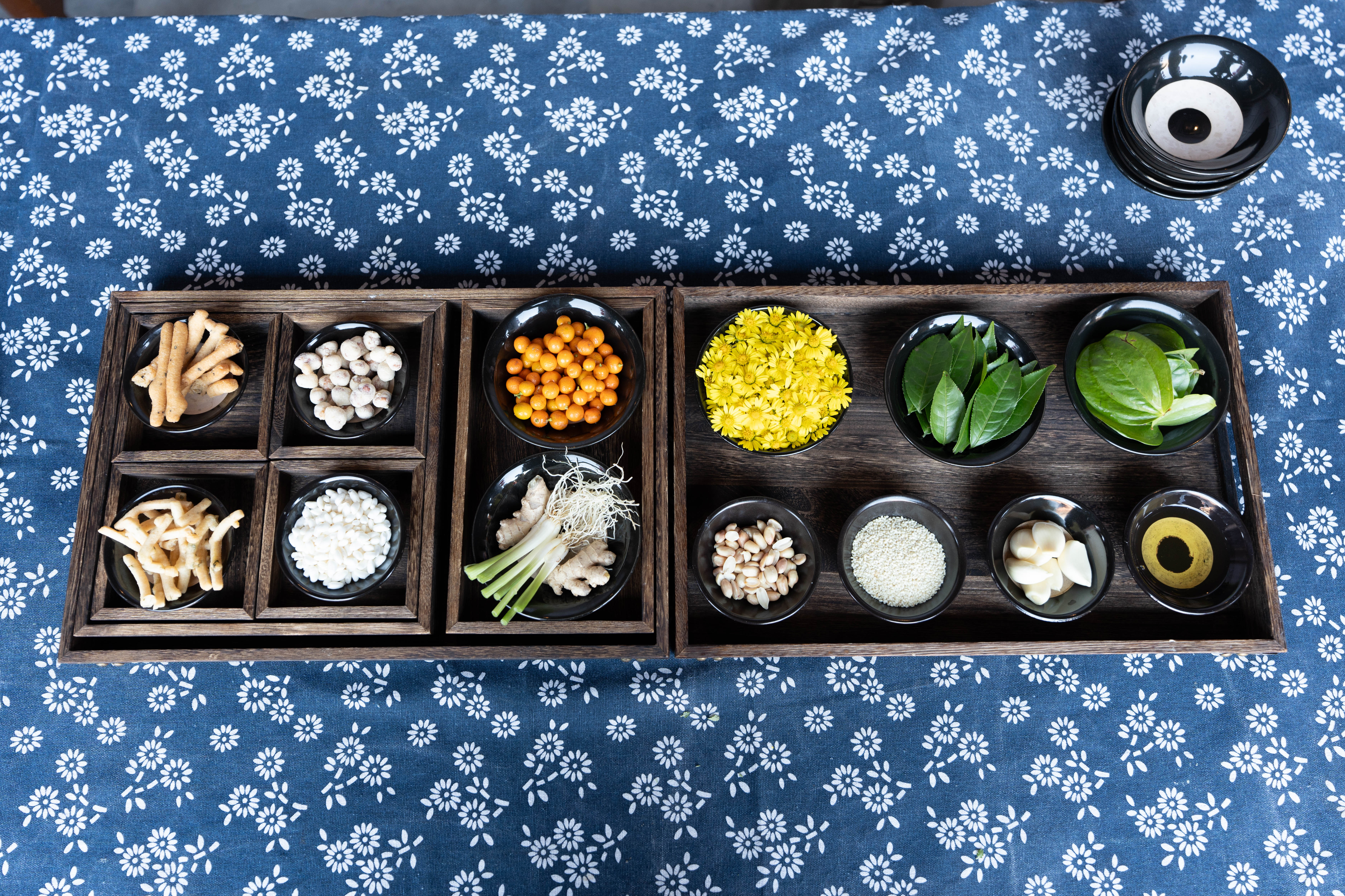 以擂茶待客,是客家地區(qū)最普遍也最隆重的禮節(jié)。黃琳的案前,整齊擺放著清晨采來的茶葉與野菊,以及花生、生姜、山茶油等制作擂茶的原料。她指尖輕巧地剔去茶梗,將各色食材置入擂臼,持棍將其碾碎。