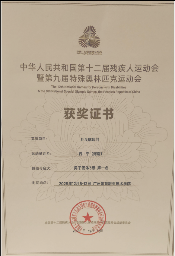 對于石寧而言,這枚金牌的意義格外厚重:從鄭周大院的悉心培養(yǎng)到2022年正式踏上專業(yè)訓(xùn)練之路,從摘得河南省第八屆殘疾人運動會銀牌,到如今在全國最高舞臺上斬獲金牌,他的每一步成長,都離不開教練、老師及社會各界的關(guān)心和支持,更離不開自身的刻苦訓(xùn)練和頑強拼搏。