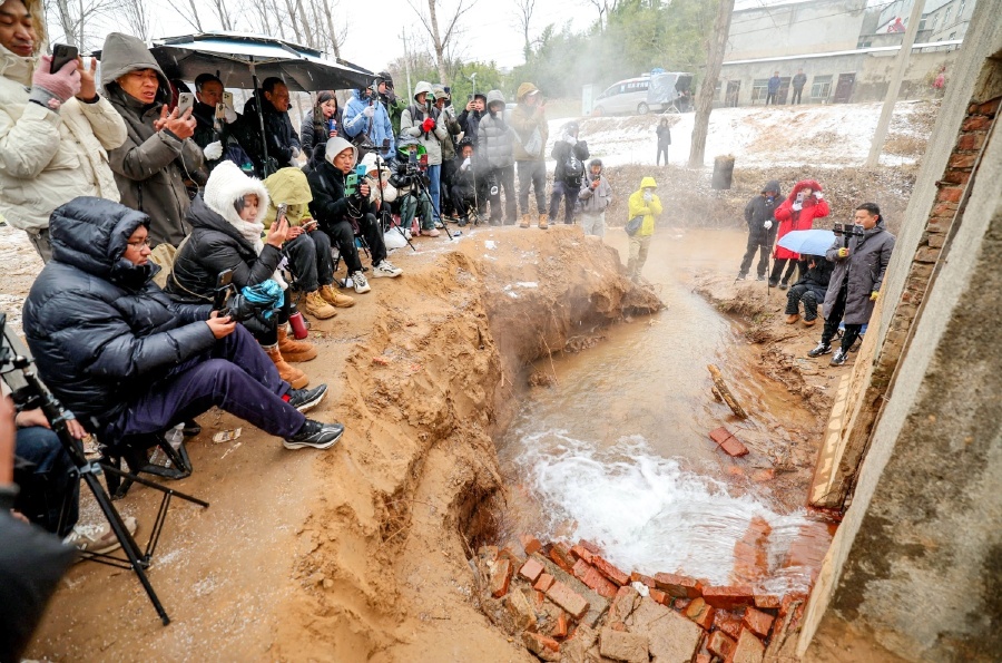 鄭州市二七區馬寨鎮閆家咀村的機井沉寂32年后,迎來復涌第13天,現場進行網絡直播的播主將噴泉梯次包圍。 由于現場人數眾多,村里給貼心安裝了衛生間導視牌,為大家提供方便。