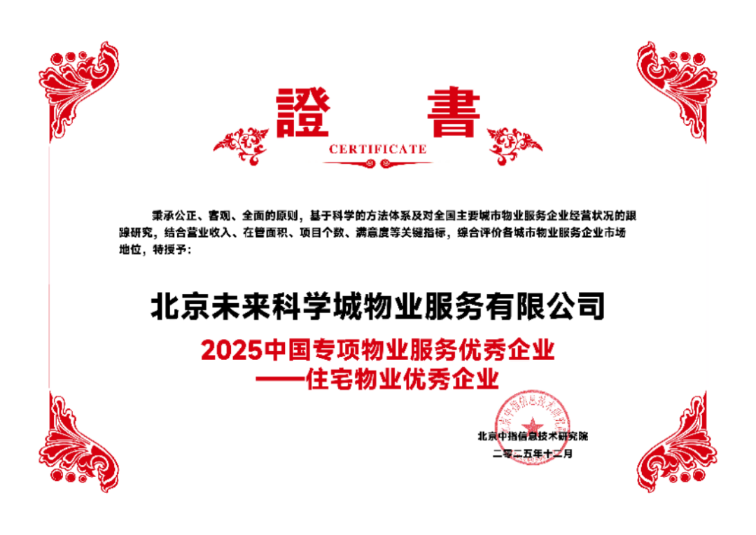 北京未來科學城物業服務有限公司憑借業內領先的綜合實力和服務水平,榮獲“2025中國專項物業服務優秀企業-住宅物業優秀企業”。