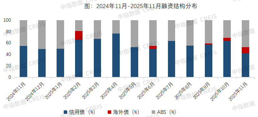 2025年1-11月,房地產(chǎn)企業(yè)債券融資總額為5502.8億元,同比增加10.5%。從融資結(jié)構(gòu)來看,房地產(chǎn)行業(yè)信用債融資3202.0億元,同比微增2.9%,占比58.2%;海外債融資161.5億元,同比增長(zhǎng)141.0%,占比2.9%;ABS融資2139.3億元,同比增長(zhǎng)19.0%,占比38.9%。