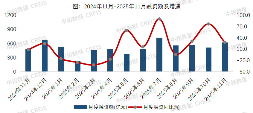 中指研究院監(jiān)測(cè),2025年11月房地產(chǎn)行業(yè)債券融資總額為620.4億元,同比增長(zhǎng)28.5%。從融資結(jié)構(gòu)來看,房地產(chǎn)行業(yè)信用債融資262.2億元,同比下降1.6%,占比42.3%;海外債融資64.2億元,占比10.3%;ABS融資294.0億元,同比增長(zhǎng)36%,占比47.4%。債券融資平均利率為2.66%,同比下降0.07個(gè)百分點(diǎn),環(huán)比上升0.1個(gè)百分點(diǎn)。