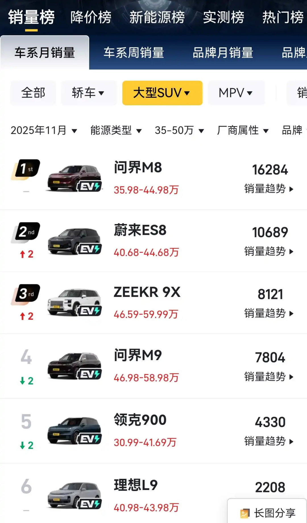 這是什么概念呢?咱們先跟友商對比。不可否認,問界M8仍舊處于遙遙領先的位置,狂賣1.6萬輛,處于斷層式領先。可在中大型SUV中,排名第二的呢?就是蔚來ES8了。第三則是剛上市的極氪9X,首月賣出8121輛。問界M9因為上市太久了,加上問界M8分流了一部分訂單,月銷跌至7804輛,下滑到第四名去了。