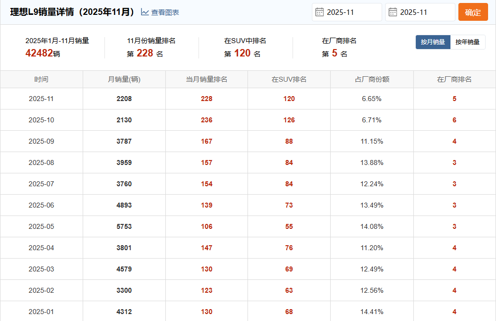 當理想汽車進入自己的高光時刻時,蔚來汽車就顯得有些跟不上節奏了。而如今,局勢反轉,理想在純電轉型中,陷入水逆,而增程車銷量大幅下滑。除了理想L6還能維持月銷約1萬臺的成績,L8、L9都遭遇了斷崖式下滑。尤其是L9,月銷已經跌入2000輛級別,相比高峰期,跌幅近80%了。