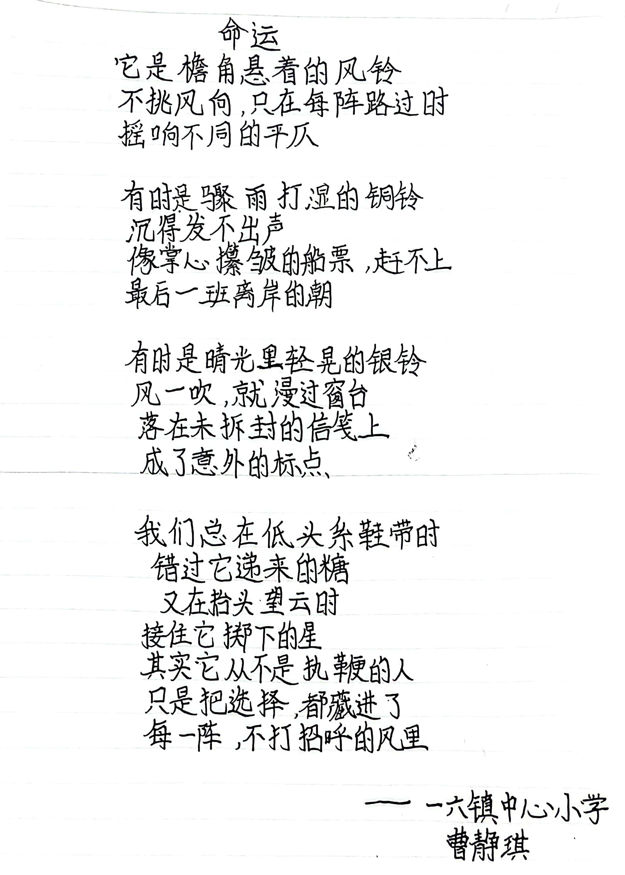 詩歌課結束后,一個平時不愛說話的孩子交上來一首《命運》,其中寫道:“命運是檐角懸著的風鈴,不挑風向,只在每陣路過時,搖響不同的平仄。”