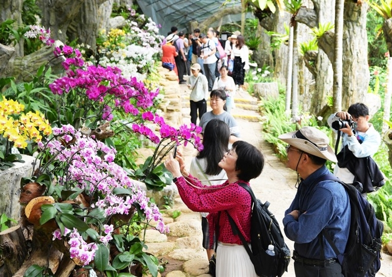 游客在亞龍灣熱帶天堂森林旅游區賞花。