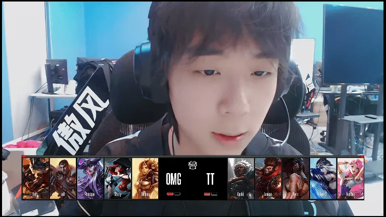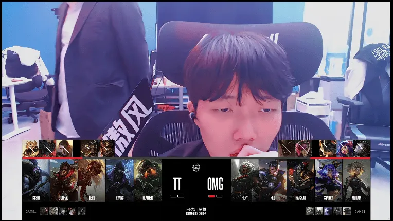第三局比賽,TT藍色方,選用:Keshi狼母、Junhao猴子、Heru阿卡麗、Ryan3寒冰、Feather薩勒芬;OMG紅色方,選用:Hery蘭博、re0杰斯、Haichao辛德拉、Starry女槍、Moham日女