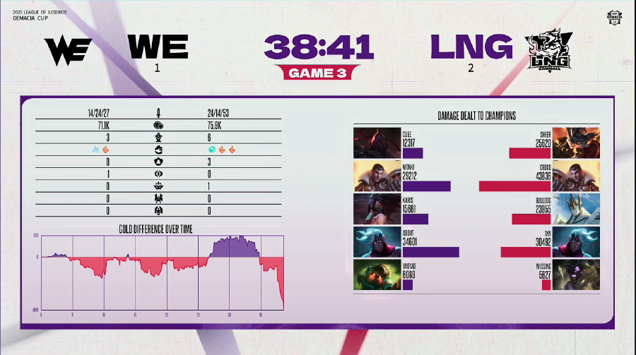 結果第三局比賽,被OMG和TT兩隊打出了花來,各種翻轉,各種逆襲,最終OMG笑到最后。12分鐘左右,OMG在龍團打出0換2;15分鐘左右,杰斯與狼母互換,后續OMG在先鋒團被打出0換2;23分鐘左右,OMG拿下厄塔汗,后續OMG擊殺狼母;24分鐘左右,TT野區開團打出0換2,隨后拿下小龍;31分鐘左右,龍魂團OMG拿下小龍,后續TT打出0換3,大獲全勝,隨后拿下大龍;32分鐘左右,TT在中路打出2換4;最終36分鐘整,TT上野在下路開日女陣亡,隨后OMG順利一波