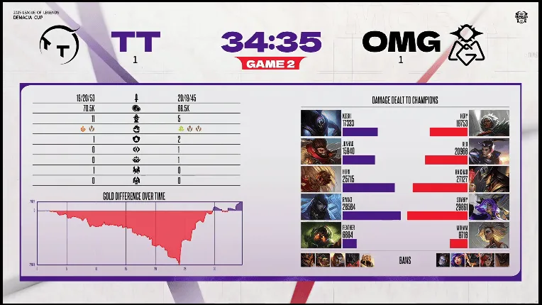 結果第二局比賽,又輪到TT上演絕世翻盤局。前25分鐘,OMG最高領先7000多的經濟,但是最后,他們卻浪了,給了TT翻盤的機會。24分鐘左右,OMG在下路再次送掉,被TT打出0換5;26分鐘左右,OMG在中路被打出1換4;28分鐘左右,TT推掉下路高地;29分鐘左右,TT打出2換3;最終34分35秒,TT拿下大龍,后續打出1換4,隨后順利一波