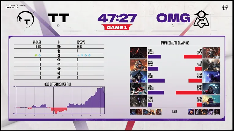 結果第一局比賽,OMG上演了“絕世翻盤”局。8分鐘左右,TT在河道打出0換2,拿下巢蟲;12分鐘左右,TT在野區擊殺潘森拿下戰隊先機;15分鐘和18分鐘左右,OMG先后打出一波0換3;20分鐘左右,OMG在下路打出0換4,隨后拿下厄塔汗;28分鐘左右,TT拿下大龍,OMG僅僅擊殺狐貍;36分鐘左右,OMG拿下龍魂;39分鐘左右,OMG在下路發難,反而上野陣亡;42分鐘和44分鐘,TT分別拿下遠古龍和大龍;最終47分27秒,TT開團,但后續被OMG打出2換5,隨后順利一波。