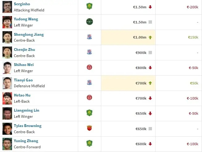 今日德轉(zhuǎn)更新中超球員身價(jià),國(guó)足球員身價(jià)中,塞爾吉尼奧與王鈺棟150萬(wàn)歐并列第一,武磊50萬(wàn)歐已跌出前十,排名第13。