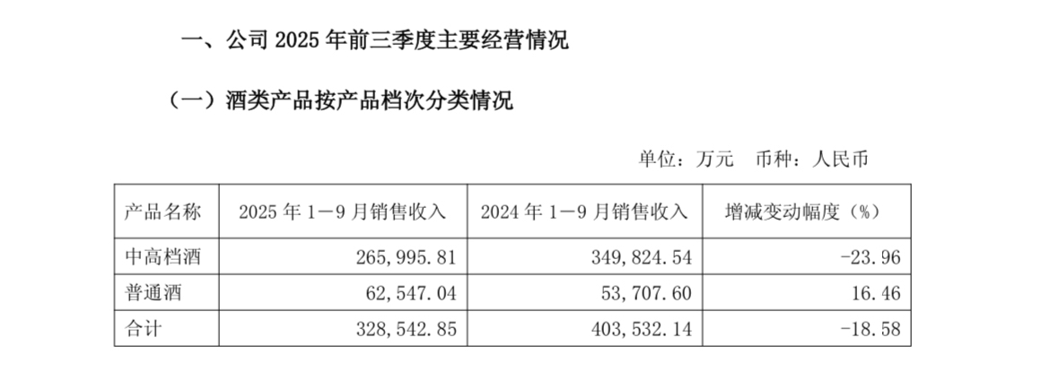 再看其產品,作為業績"主引擎"的中高檔酒,如今也盡顯疲態。2025年前三季度,舍得中高檔酒營收26.60億元,較2024年同期減少8.38億元,營收貢獻率從86.69%降至80.97%;而公司普通酒雖迎來一定增長,但也根本無力拉動整體業績。