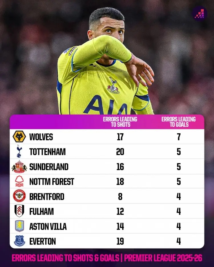 Opta統(tǒng)計(jì)了本賽季英超各隊(duì)失誤導(dǎo)致丟球的數(shù)量,并列出榜單,狼隊(duì)7球居首,熱刺、桑德蘭、諾丁漢森林5球次席。