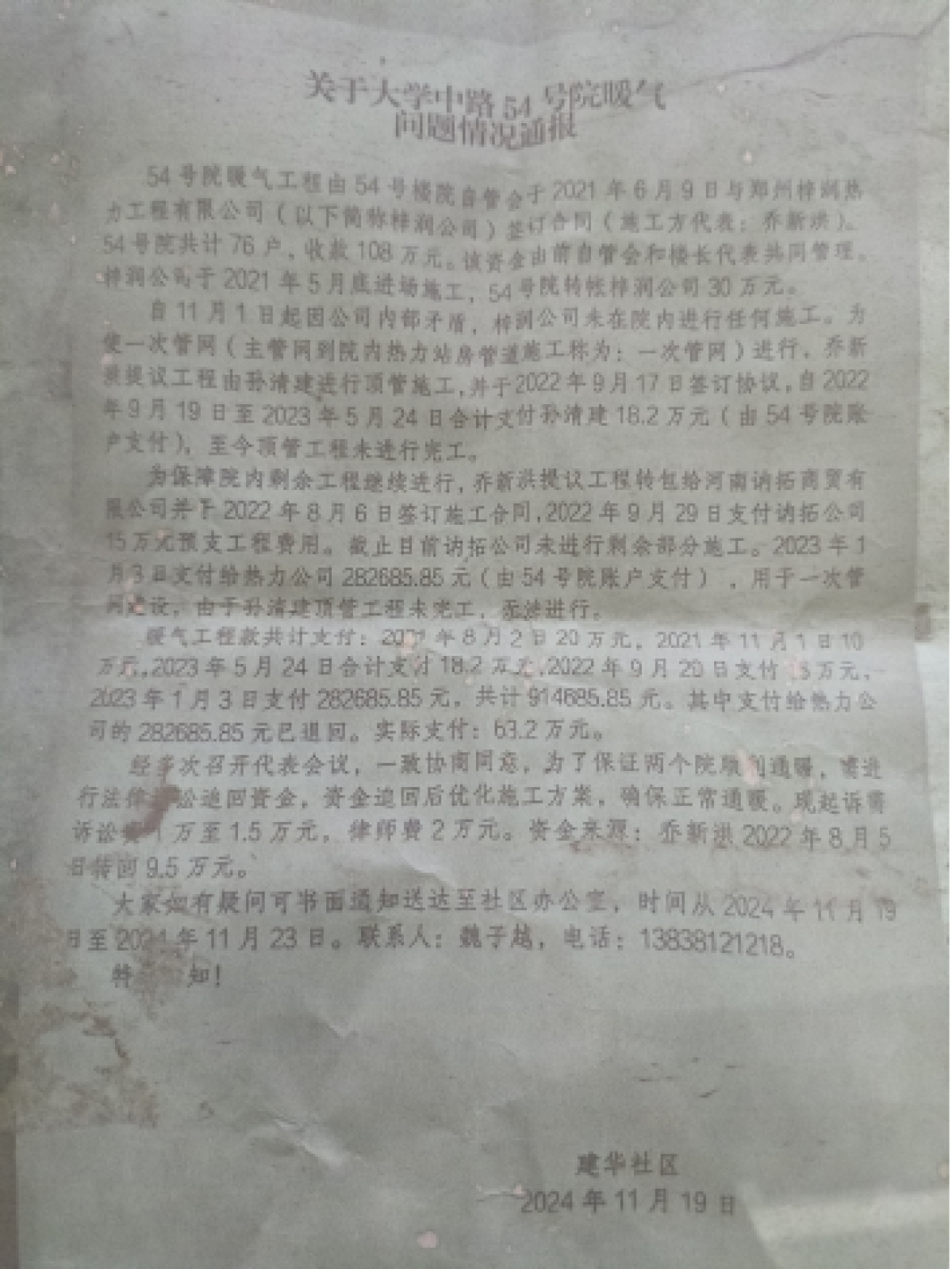 《通報》中提到,54號院暖氣工程由54號樓院自管會于2021年6月9日與鄭州梓潤熱力工程有限公司(以下簡稱梓潤公司)簽訂合同(施工方代表:喬新洪)54號院共計76戶,收款108萬元。該資金由前自管會和樓長代表共同管理,梓潤公司于2021年5月底進場施工,54號院轉賬梓潤公司30萬元。