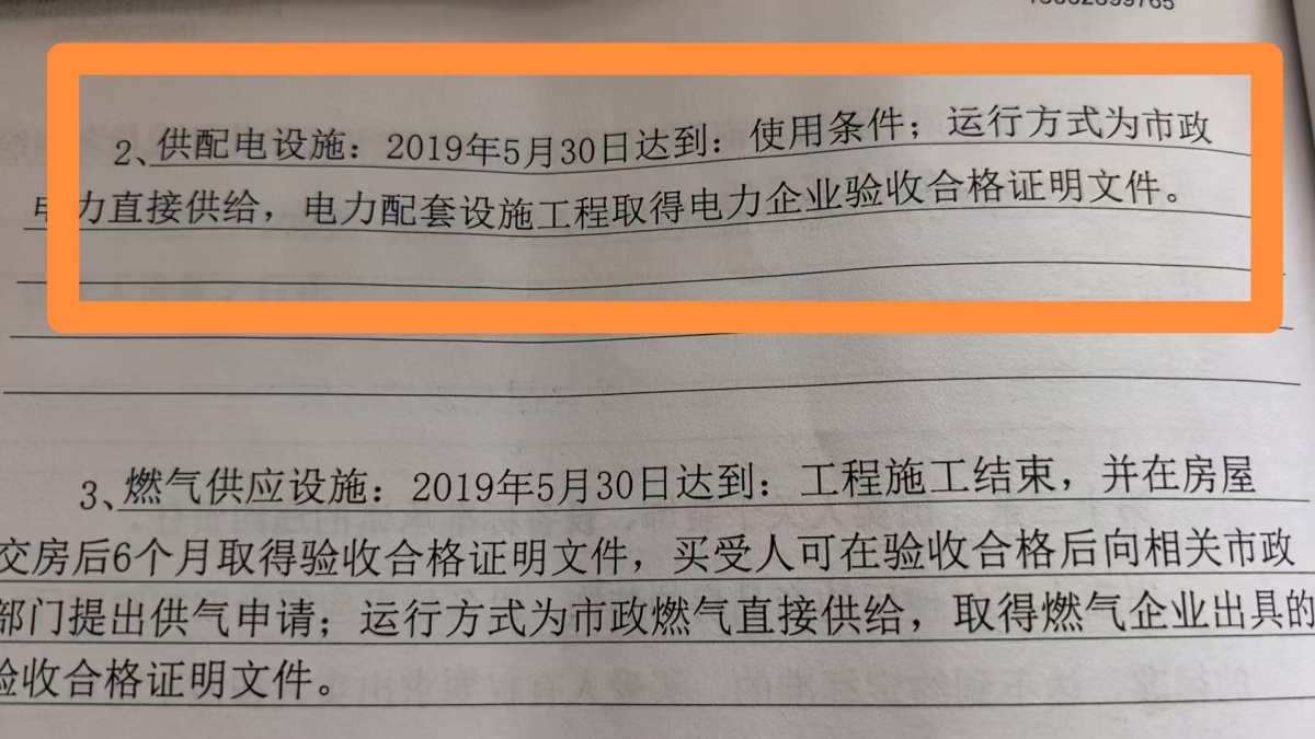 有業(yè)主代表告訴記者,綠地城一區(qū)于2019年12月交付,可交房時(shí)諸多配套設(shè)施都不完善,6年過(guò)去了,小區(qū)至今用的還是臨時(shí)電,更別提心心念念的集中供暖。隨后,居民代表拿出了購(gòu)房時(shí)簽訂的《商品房買賣合同》,記者清晰看到,合同中明確約定:“暖氣在市政熱力公司管網(wǎng)到達(dá)后第二個(gè)采暖期供暖,運(yùn)行方式為市政管網(wǎng)集中供暖。”