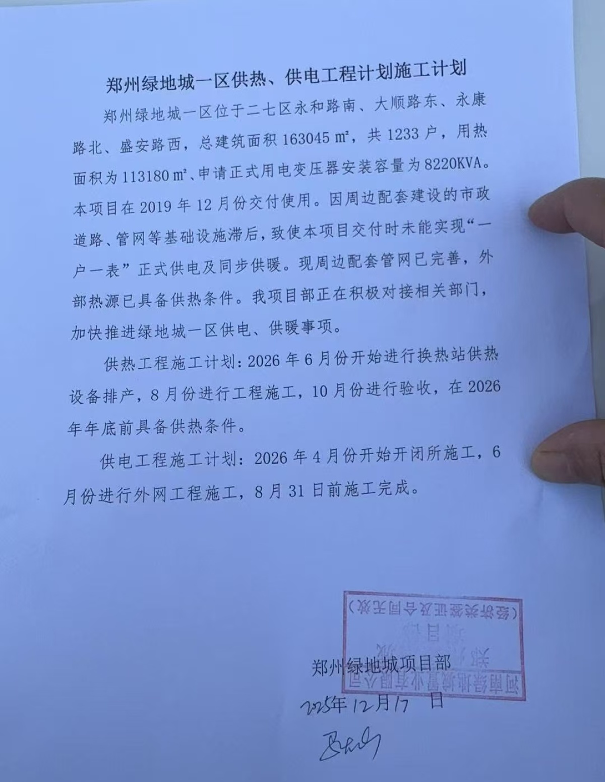 12月17日下午,好消息傳來(lái),開發(fā)商承諾給業(yè)主的推進(jìn)節(jié)點(diǎn)——書面蓋章版《鄭州綠地城一區(qū)供熱、供電工程施工計(jì)劃》已交到業(yè)主手中。該書面計(jì)劃書中顯示,關(guān)于供熱的施工計(jì)劃是:2026年6月開始進(jìn)行換熱站供熱設(shè)備排產(chǎn),8月份進(jìn)行工程施工,10月份進(jìn)行驗(yàn)收,在2026年年底前具備供熱條件。