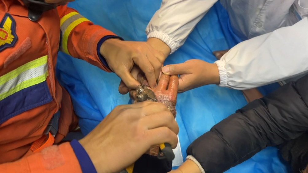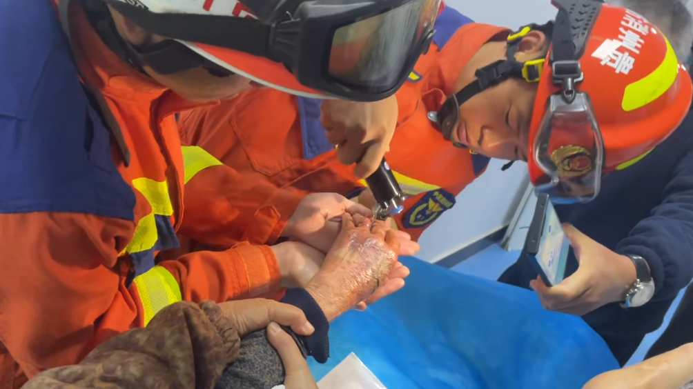 消防員使用工具一點(diǎn)點(diǎn)對戒指進(jìn)行破拆