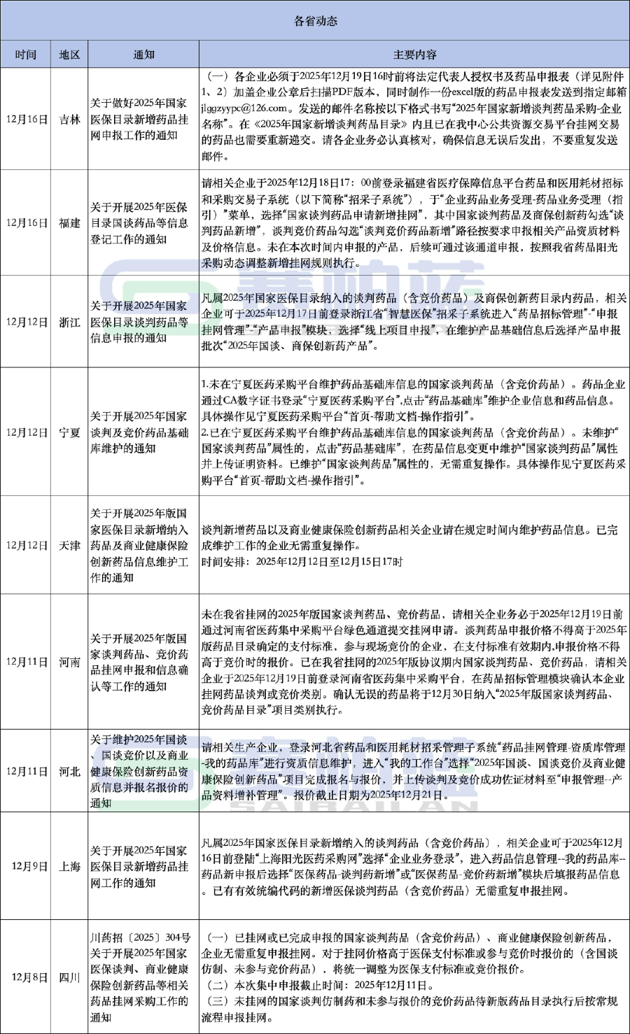 但各地時間節點存在差異,如浙江省相關企業可于2025年12月17日前登錄浙江省“智慧醫保”招采子系統進入“藥品招標管理”-“申報掛網管理”-“產品申報”模塊,選擇“線上項目申報”,在維護產品基礎信息后選擇產品申報批次“2025年國談、商保創新藥產品”;天津市要求談判新增藥品以及商業健康保險創新藥品相關企業在規定時間內(12月12日至12月15日17時)維護藥品信息。