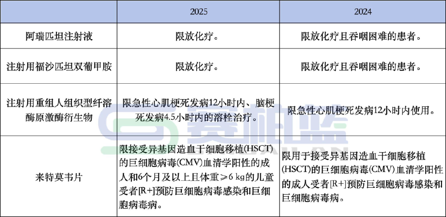 另有阿瑞匹坦注射液、注射用福沙匹坦雙葡甲胺、注射用重組人組織型纖溶酶原激酶衍生物、來特莫韋片這些藥品支付限制放寬。