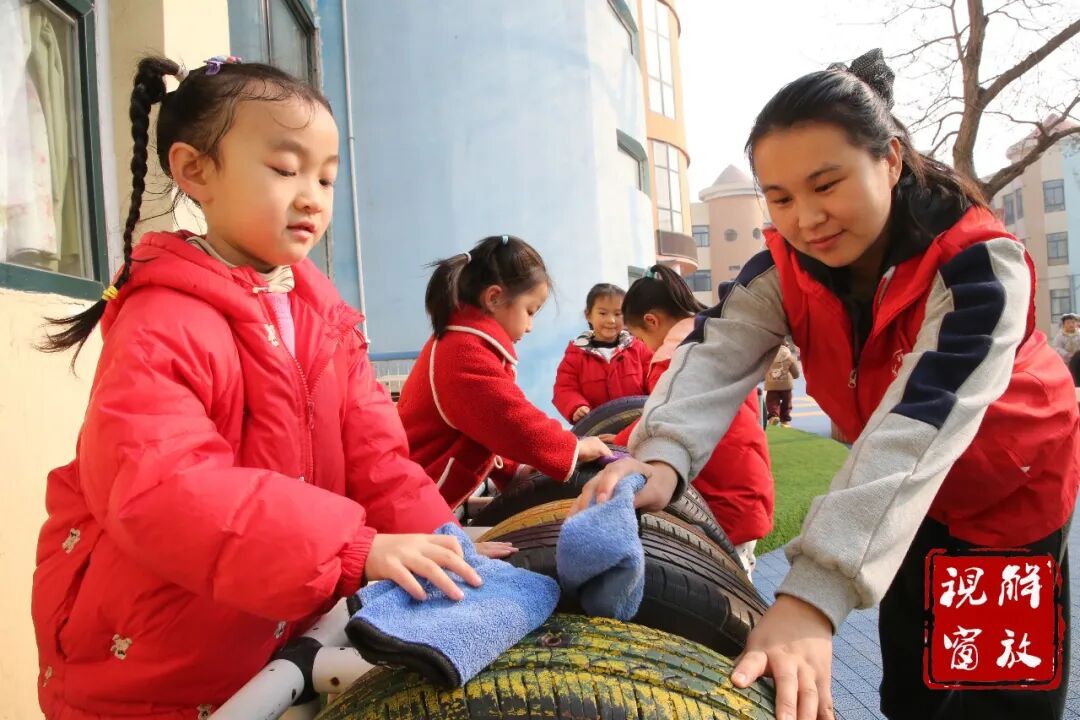區第一幼兒園的孩子在老師帶領在清理園內衛生