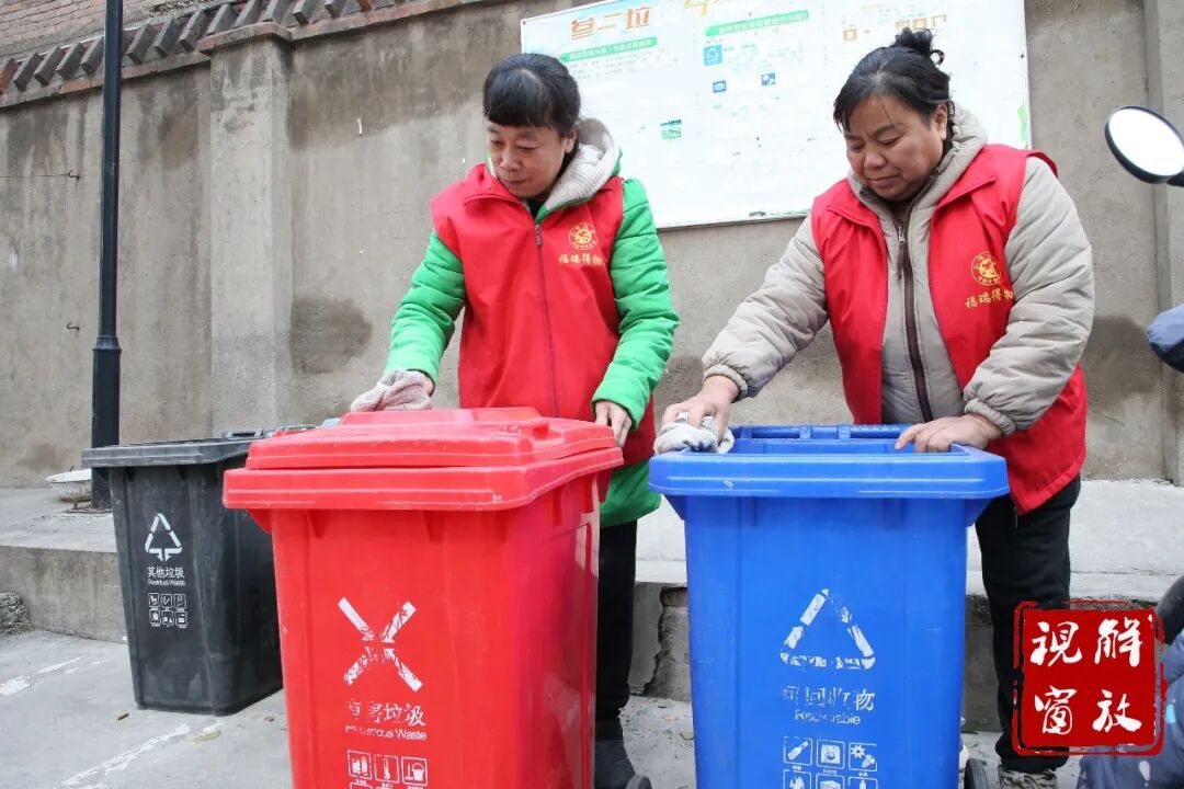 焦西街道電翔社區志愿者清理分類垃圾桶