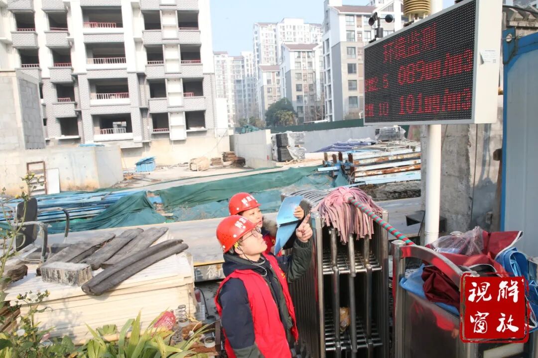 焦北街道幸福街社區志愿者正在建筑工地檢查環境監測儀器運轉情況