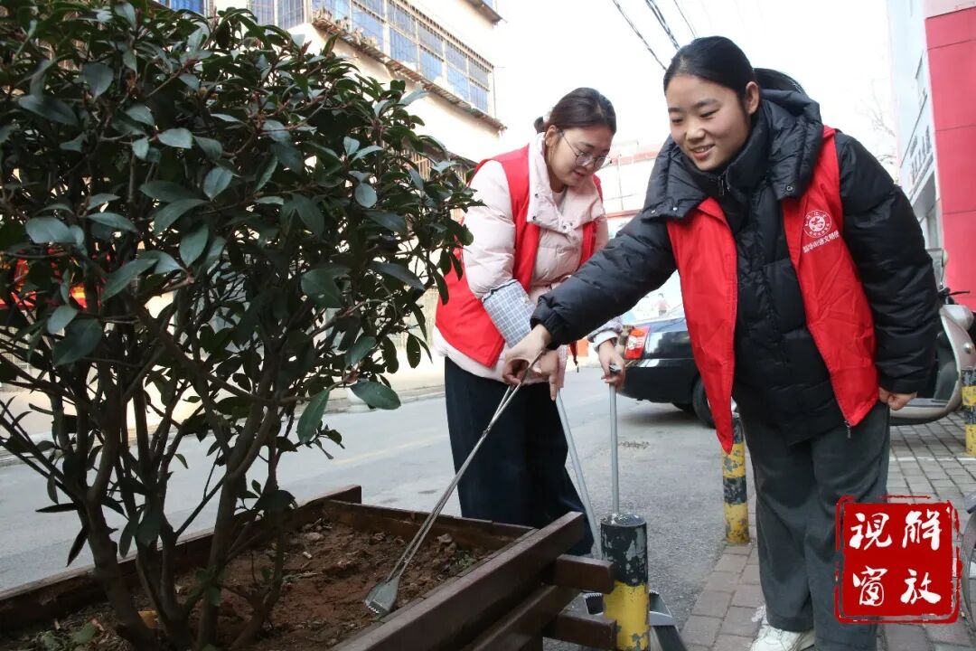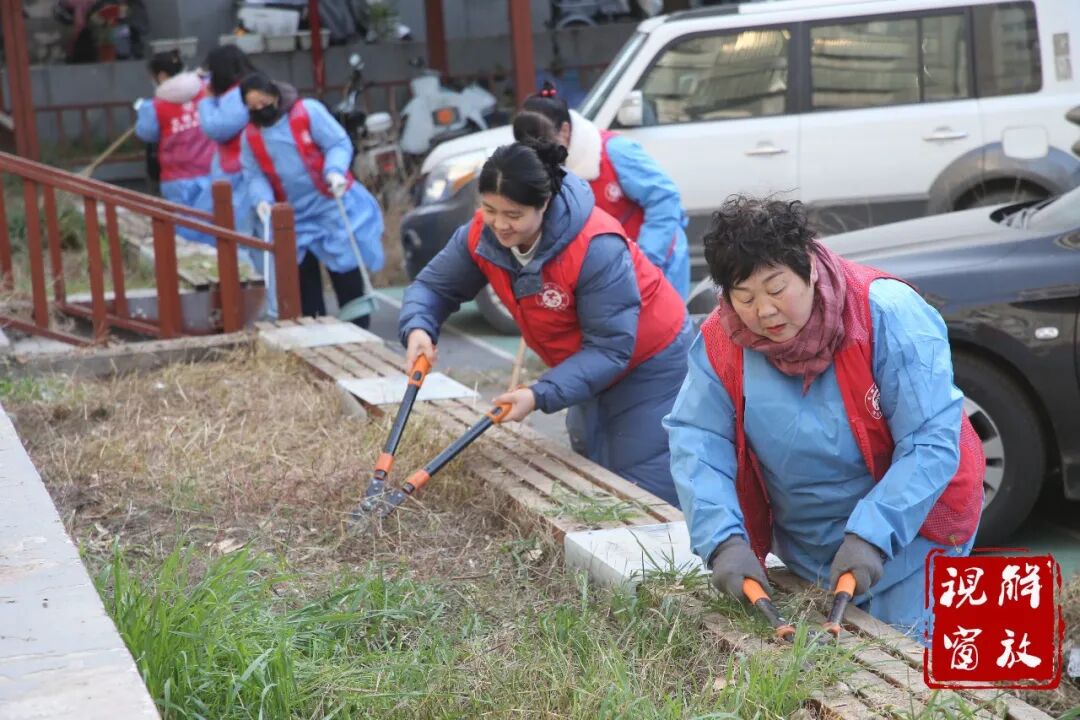 民生街道學生路社區志愿者正在綠化池內清除垃圾雜草