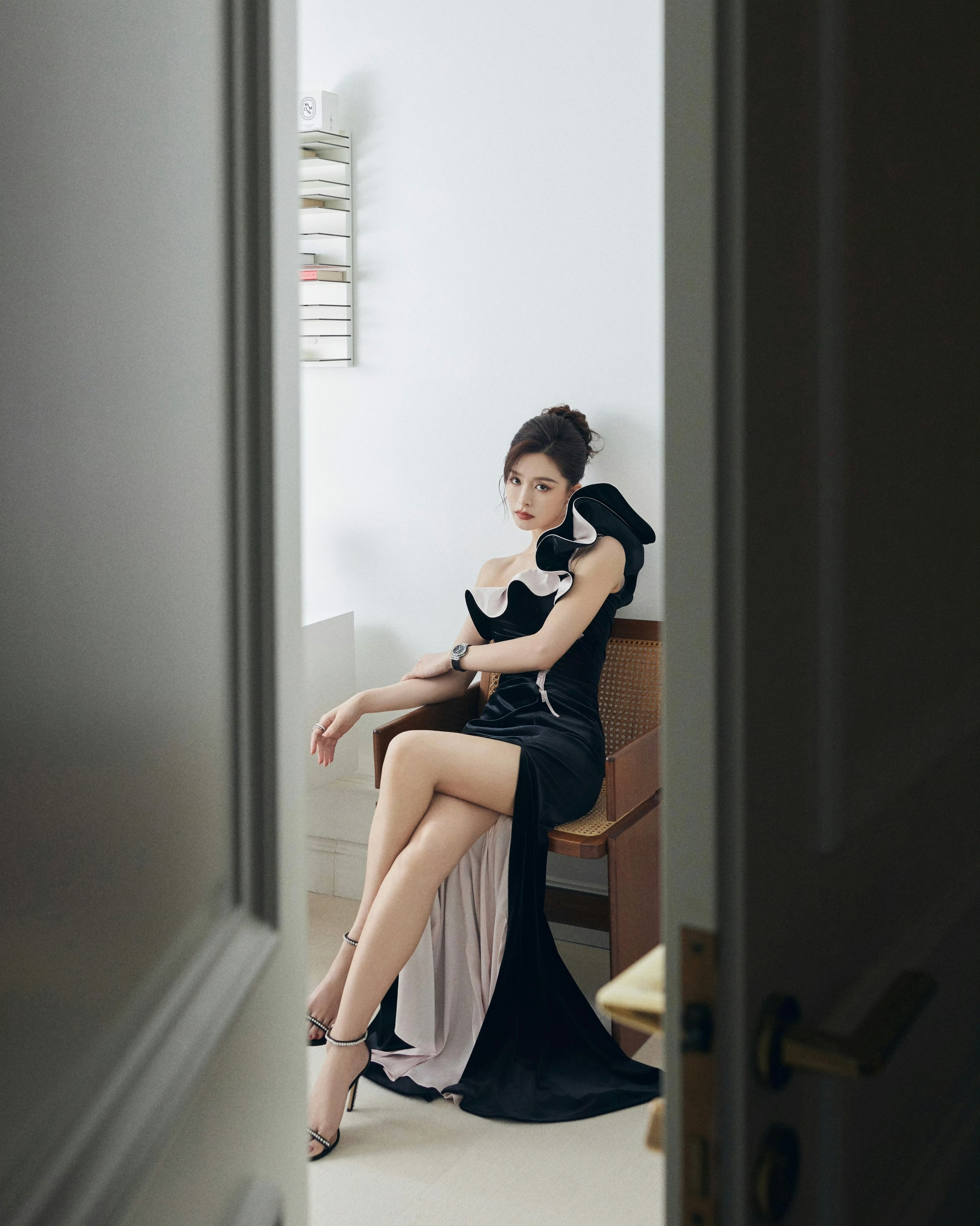 丸子頭的造型利落又靈動,與禮裙的柔媚形成反差,腕間的腕表更是點睛之筆,讓優雅中多了幾分干練。一顰一笑間,既有女性的柔美韻味,又透著強大的氣場,將成熟女性的魅力展現得淋漓盡致。