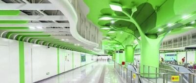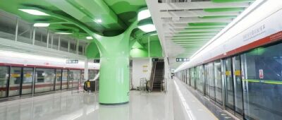 同步建設的溪涌站圍繞“陽光+”設計理念,在山海資源豐富的自然環境基礎上引入“生態綠谷”概念,將古樹意象融入車站建筑結構與燈光設計,兩側墻面以遠山輪廓為靈感延展空間視覺,使站體與周邊生態環境自然銜接。