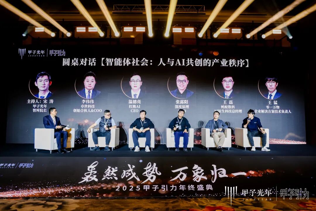 12月3日下午,在2025甲子引力年終盛典中,甲子光年智庫院長宋濤作為主持人,對話卓世科技創始合伙人&COO李偉偉、紅熊AICEO溫德亮、深度原理COO張露陽、螞蟻數科AI原生科技總經理王磊、零一萬物企業解決方案技術負責人王猛,圍繞《智能體社會:人與AI共創的產業秩序》這一主題展開了深入探討。