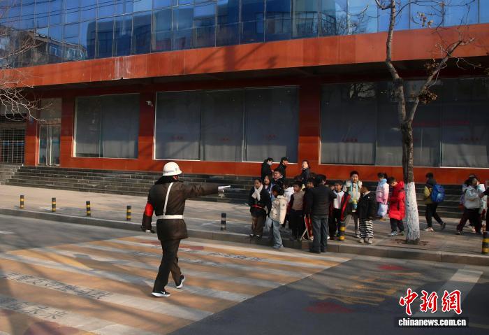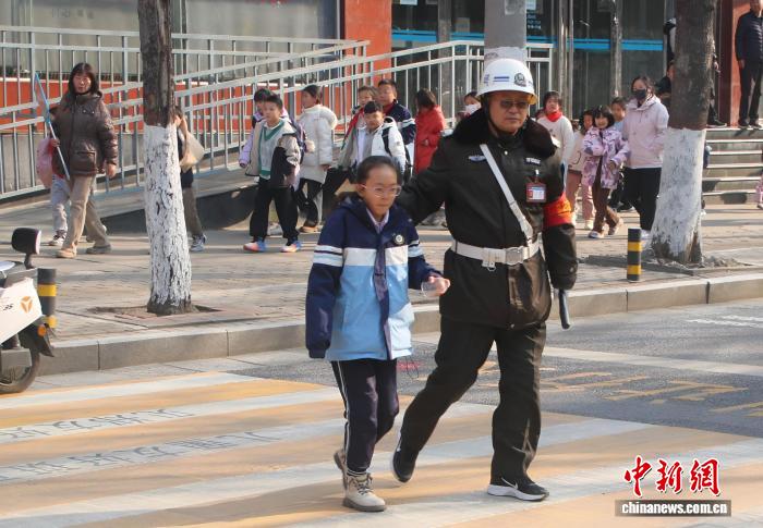 圖為上學高峰時段巡邏人員護送學生穿行彩色斑馬線。 張楠 攝