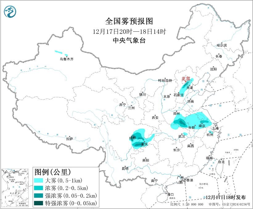 預計,12月17日夜間至18日上午,河北中南部、北京東南部、天津北部、河南東南部、安徽中北部、江蘇中西部、湖北北部、四川盆地中南部、重慶中西部等地的部分地區有大霧,其中,河北中部、河南南部、江蘇中南部、四川盆地中南部、重慶西部等地的部分地區有能見度低于500米的濃霧,河北中部、河南南部、四川盆地中南部、重慶西部等地局地有能見度低于200米的強濃霧。