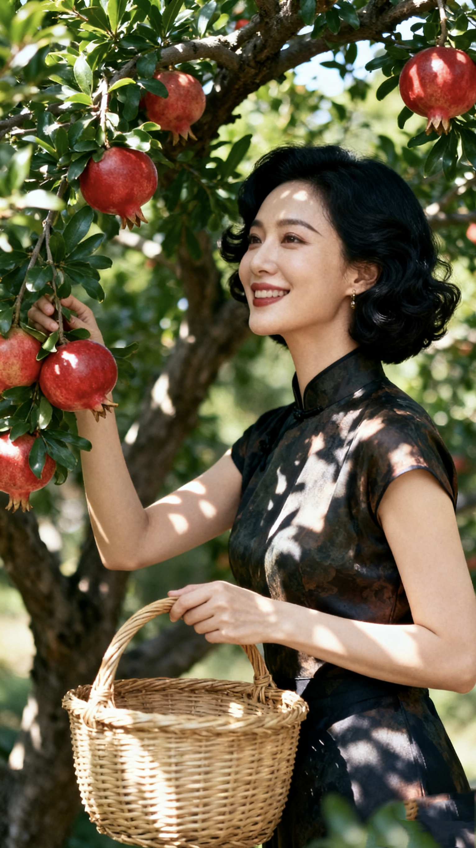 她伸手去夠那掛在枝頭的石榴,指尖輕繞果柄,動作慢而柔,仿佛怕驚擾了這秋日的寧靜。竹編的提籃垂在臂彎,藤條的紋路粗糙卻溫暖,與香云紗的細膩形成奇妙的對比,就像生活里的粗糲與精致,總能在某個瞬間達成和解。枝頭的石榴挨挨擠擠,果皮上的紅暈暈染開來,像姑娘頰邊的胭脂,而她的笑,比這榴果更甜,眼角的細紋里,藏著時光沉淀的從容。