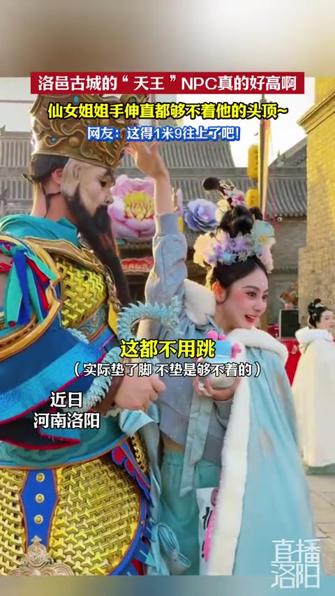 洛邑古城的“天王”NPC真的好高啊, 仙女姐姐手伸直都夠不著他的頭頂~網友:這得1米9往上了吧!#洛陽 #洛邑古城