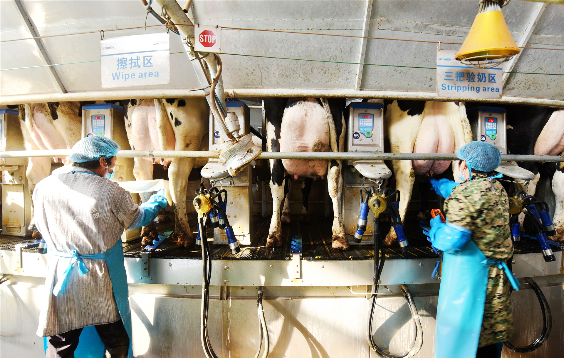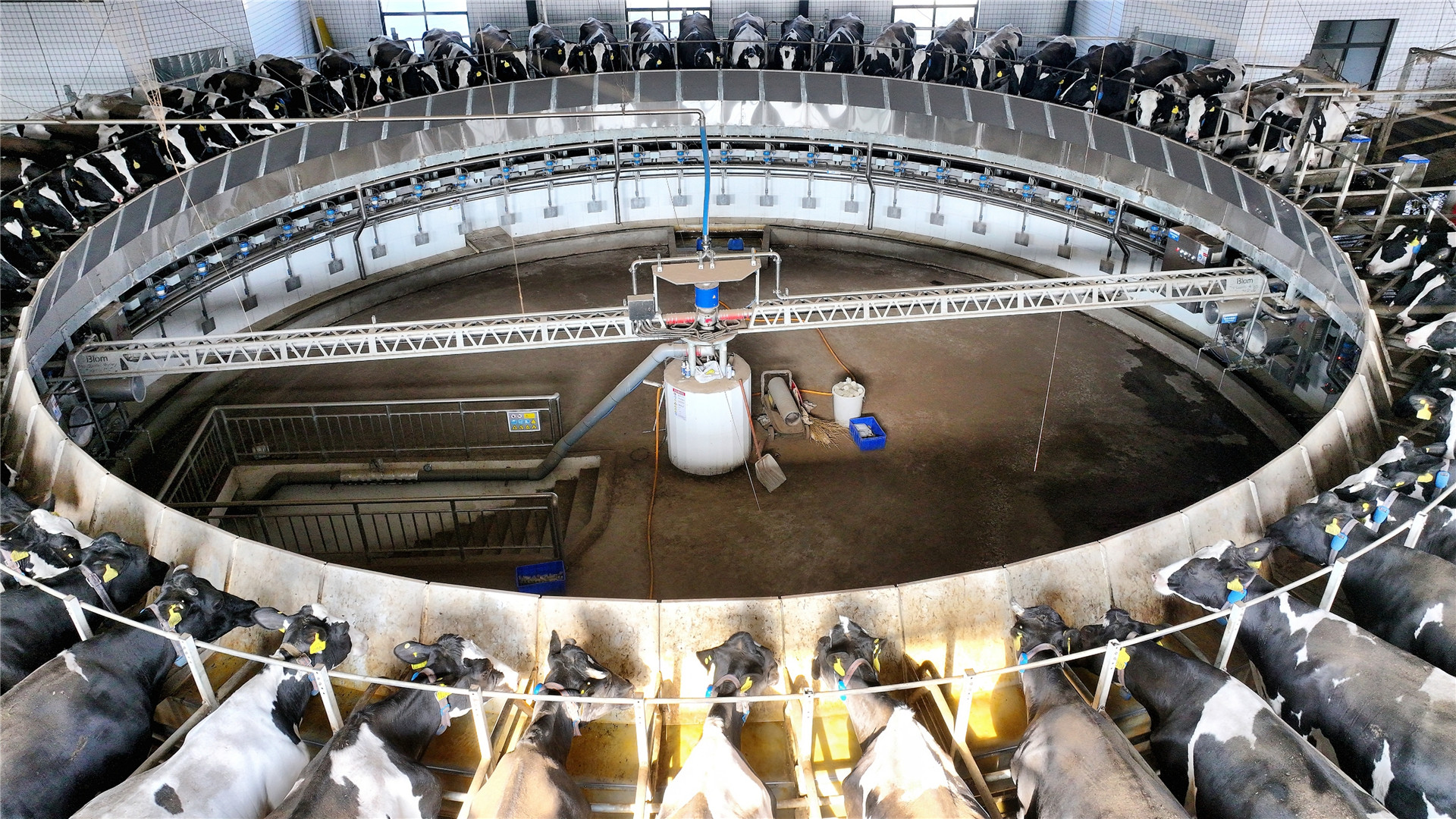 而在擠奶大廳里,智能化圓形擠奶轉盤上,一頭頭奶牛開始了自動化擠奶,約10分鐘后擠奶器自動脫落,完成“任務”的奶牛走下轉盤。鮮奶通過管道進入罐裝車,經過低溫殺菌后就立即“奔向”洛陽科迪巨爾乳業、湖南新希望南山液態乳業等目的地。
