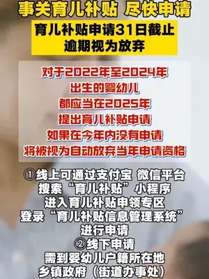線上可通過支付寶、微信平臺搜索“育兒補貼”小程序,進入育兒補貼申領專區,登錄“育兒補貼信息管理系統”進行申請。