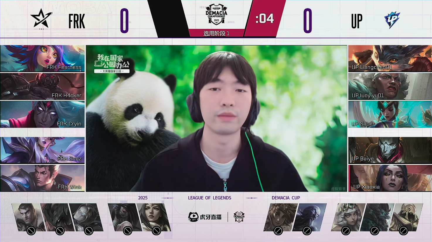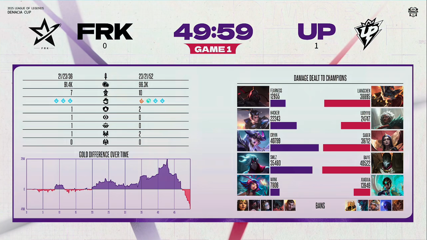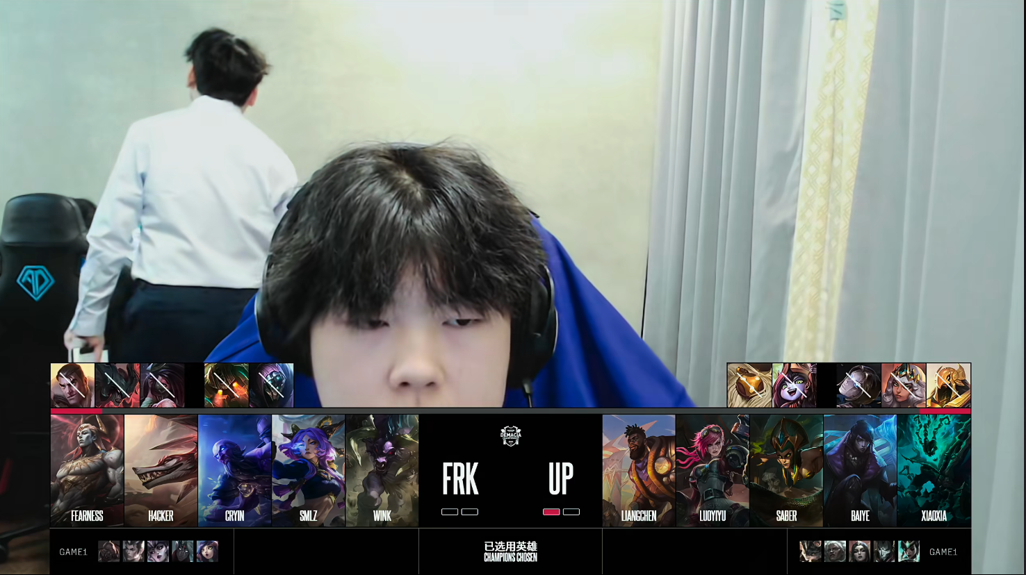 第一局比賽,FRK藍色方,禁用:杰斯、劍魔、發條、阿卡麗、輪子媽,選用:Fearness塞恩、H4cker趙信、Cryin辛德拉、SMLZ維魯斯、Wink妮蔻;UP紅色方,禁用:沙皇、巨魔、奇亞娜、瑞茲、巖雀,選用:Liangchen蘭博、Luoyiyu狼母、Saber妖姬、Baiye燼、Xiaoxia扇子媽