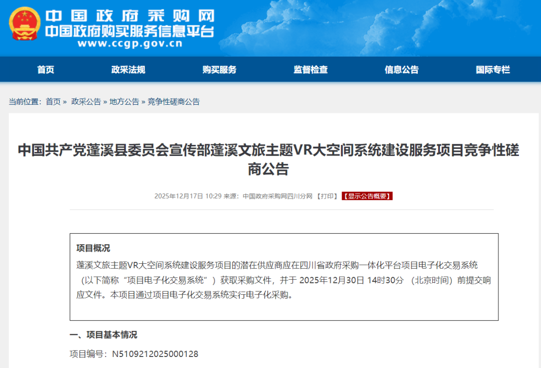 12月17日,中國政府采購網發布蓬溪文旅主題VR大空間系統建設服務項目競爭性磋商公告。