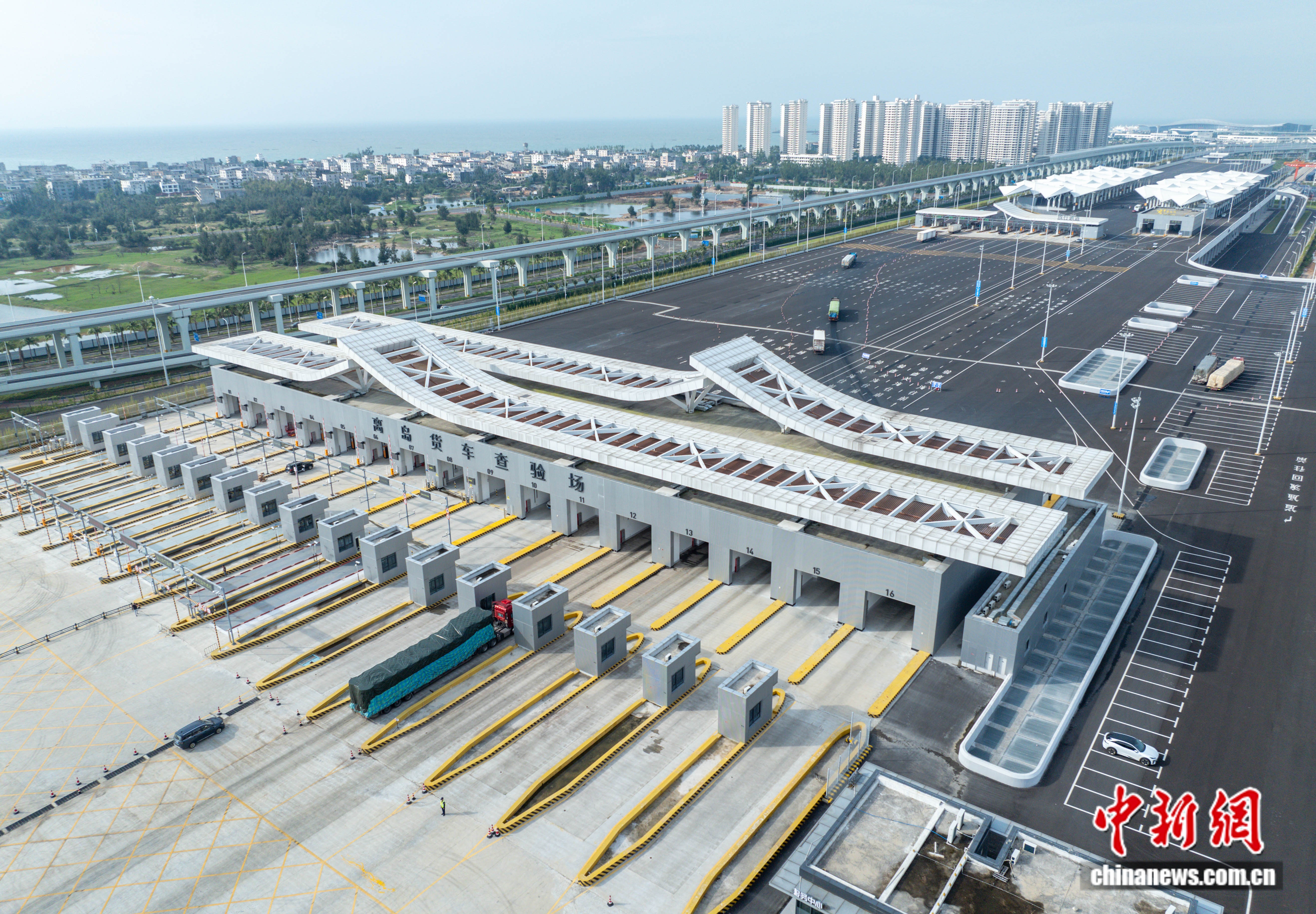 2025年11月11日,海口新海港和南港“二線口岸”(貨運)集中查驗場。(無人機照片) 中新社記者 駱云飛 攝