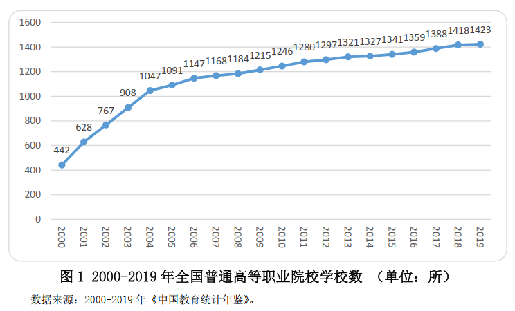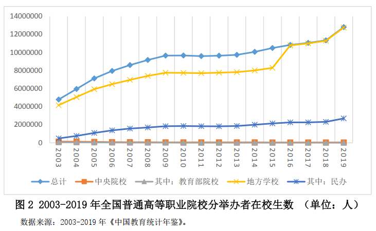 目前,中國正在舉辦世界上規模最大的高等職業教育體系,同時也是世界上規模最大的公辦職業教育體系。該體系具有三個明顯的特征。首先,以教育部門為主導。高等職業教育以公辦院校為主,以教育部門舉辦的院校為主,國有企業辦學的規模在持續縮減。其次,高等職業教育學校數和在校學生數迅速增長,規模位居世界前列。圖1展示了歷年中國高等職業教育事業的發展趨勢,可以發現高等職業院校學校數從2000年的442所上升到2019年的1423所,增長非常迅速。圖2表明,地方院校是中國大規模職業教育體系的辦學主體,其中民辦學校占據了大約四分之一的比例。