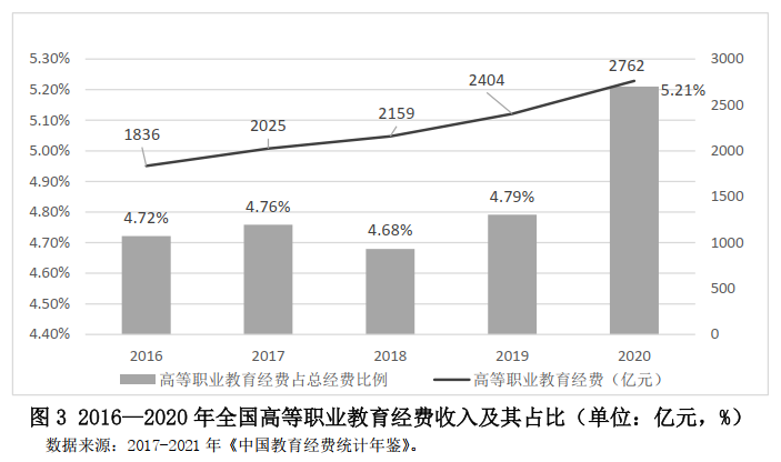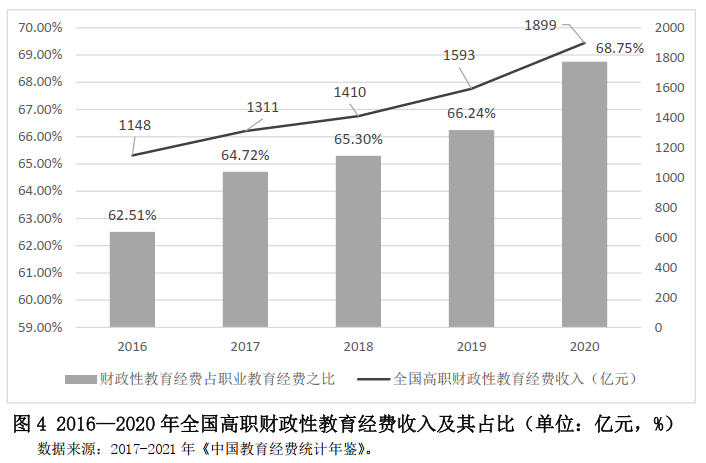 除了規模大、增長快的特點外,中國高等職業教育還是公共成本較高的教育體系。從圖3可以看到,高等職業教育經費收入占全國教育經費總收入的比例已經從2016年的4.72%上升到2020年的5.21%,圖4進一步反映出在高等職業教育經費收入中,國家財政性教育經費占比從62.5%上升到68.8%。同期,高等本科學校教育經費收入占全國教育經費總收入的比例從20.93%小幅度下降到20.87%;國家財政性教育經費占比從62.07%小幅度上升到62.56%。這表明,從公共財政負擔角度來看,中國的高等職業教育對公共財政的依存度較高。