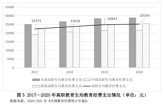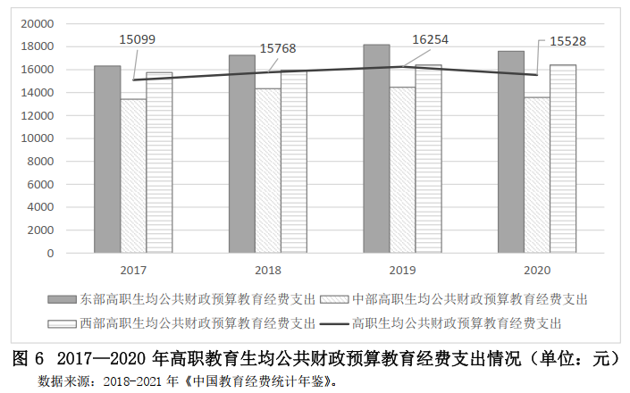 圖5顯示了從2017年到2020年,中國高職生均經費支出從2.2萬元上漲到2.5萬元。其中,財政性教育經費支出保持在1.5萬元的水平,從歷史角度看這類院校總體來說獲取了更多的公共財政支持。