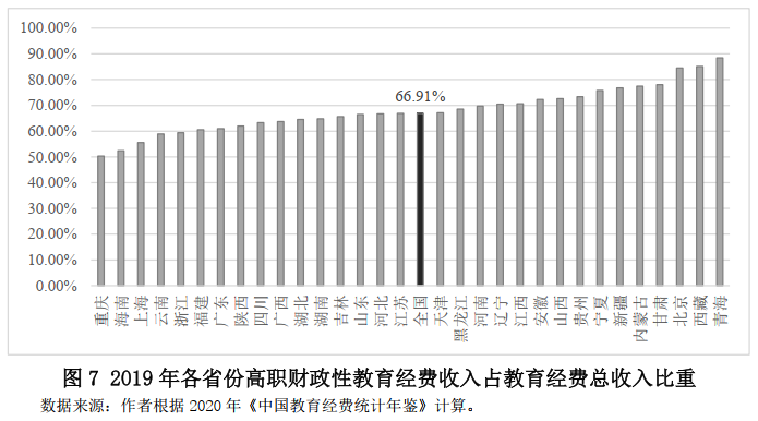 從全國層面數據來看,省級高等職業教育體系正在快速發展,但同時也存在區域發展不均衡的問題。從高等職業教育財政性經費投入占教育總經費投入比例來看(圖7),可以發現全國水平約為66.9%,區域差異明顯。不同省份高職教育的財政投入程度存在較大差異。