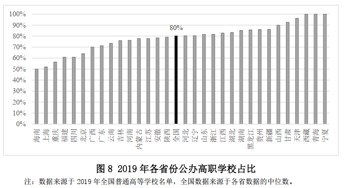 這一現象可以進一步引申出對高職教育領域中政府和市場角色的討論。圖8描述了不同省份公辦高職占全部高職院校的比例。平均來看,全國公辦高職的比例是80%,但是地區差距明顯。西部地區的寧夏、青海和西藏全部是公辦高職。海南、上海和重慶公辦高職比例不足60%,這三個省份同時也是財政性投入比例較低的省份。