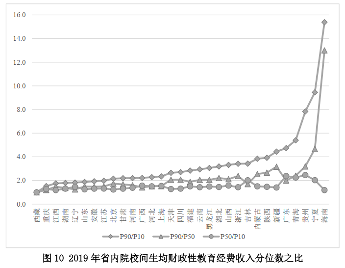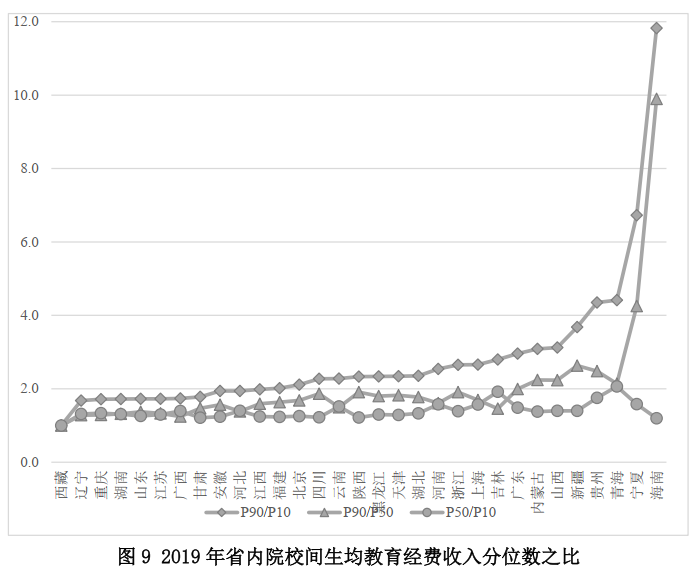 另外,從省內差距的角度來看,省內院校間經費差距大。利用2019年全國高等職業院校經費統計數據,本文計算了各省內部院校間生均教育經費收入和生均財政性教育經費收入的離散程度,所用指標包括分位數之比(P90/P10, P90/P50, P50/10)和變異系數(圖9)。首先,省內高職院校之間教育經費收入的差異較大。比較處于90分位數和10分位數院校的生均教育經費收入,全國各省份比值在1.7到3.0之間。其次,生均教育經費收入差距主要來自最高10%院校與中位數院校的差距。分析發現,各省P90/P50的比值一般大于各省P50/10的比值,說明頭部與中部院校的差異普遍大于中部與尾部院校的差異。最后,生均財政性經費收入的院校間差異大于生均教育經費收入的院校間差異。比較生均教育經費收入和生均財政性教育經費收入,后者的省內差異大于前者。