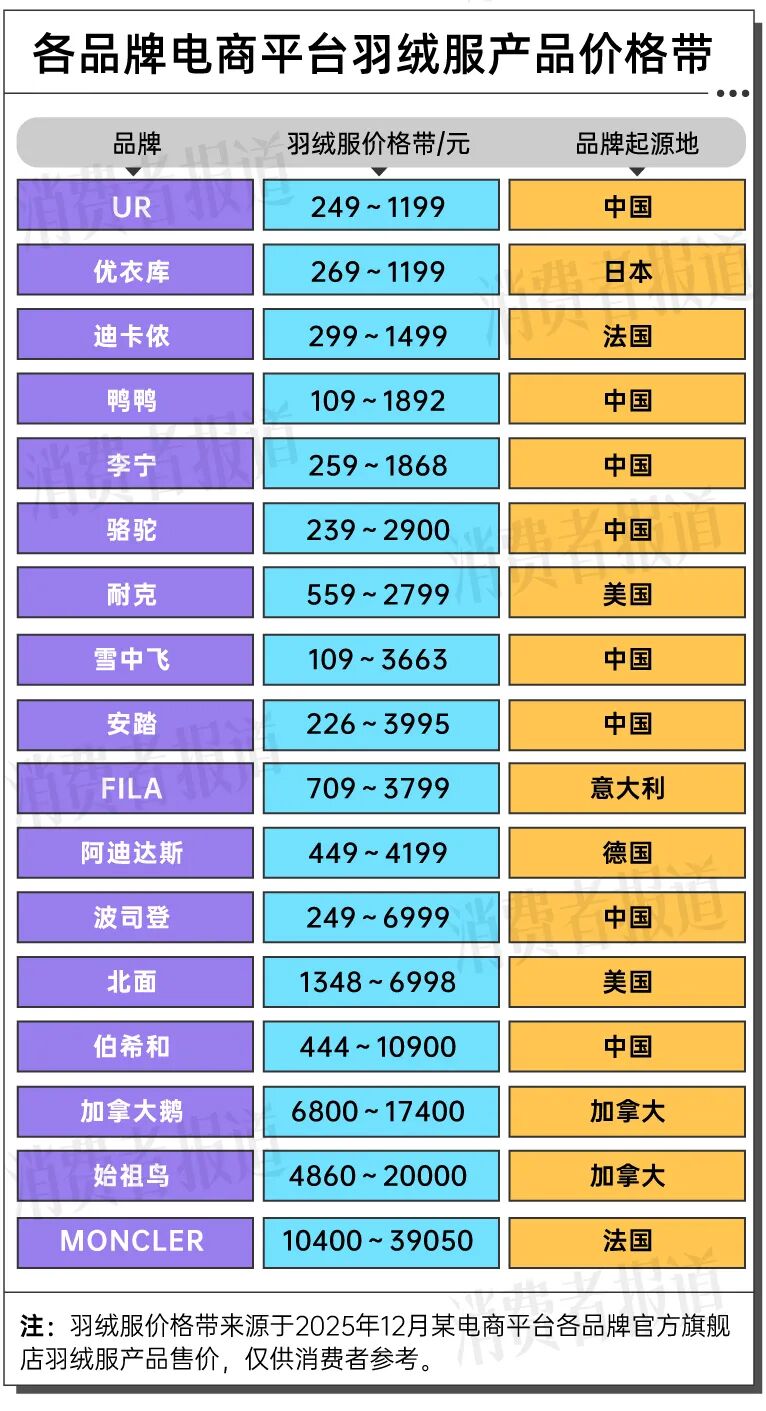 國內羽絨服消費市場呈現出“國際品牌向下,國產品牌向上”的品牌格局變化態勢。《消費者報道》記者近日統計了目前電商平臺上各品牌羽絨服產品價格情況,發現羽絨服高端價格帶仍由國際品牌占據,如Canada Goose(加拿大鵝)、ARC'TERYX(始祖鳥)、MONCLER(盟可睞)等;中低端價格帶由國產品牌占據,如鴨鴨、李寧、駱駝、安踏等。不過,這種格局并非一成不變的,不僅國際品牌有向下拓展的需求,國產品牌亦有向上進攻的趨勢。