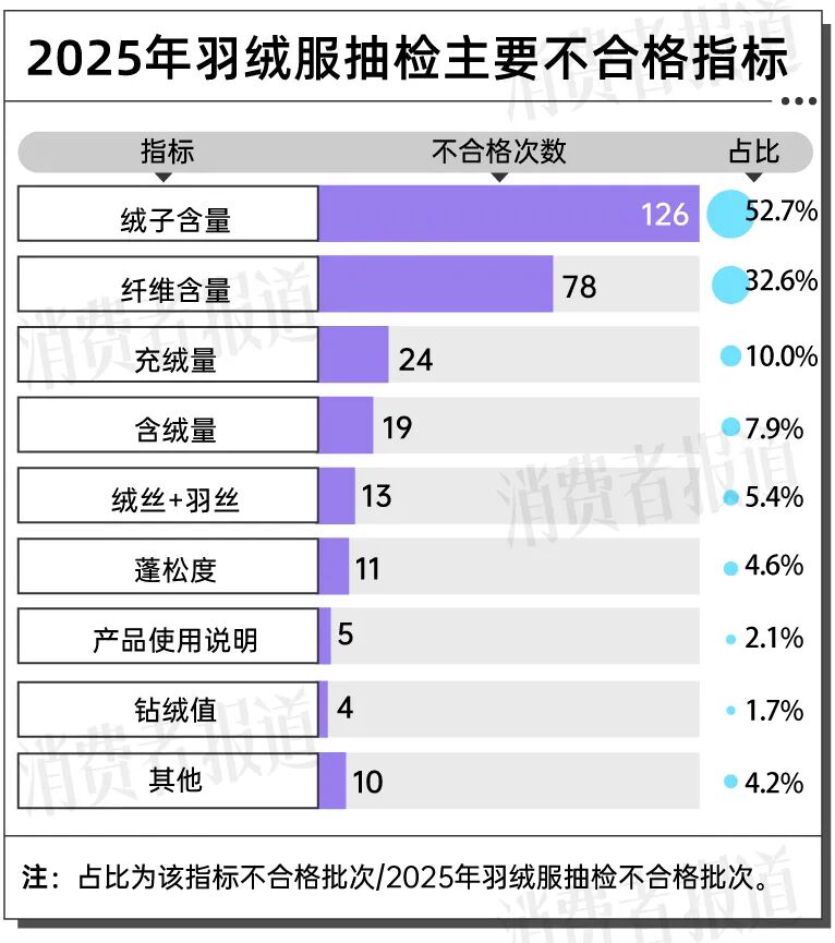 抽檢數據顯示,絨子含量不達標是羽絨服不合格的主因。