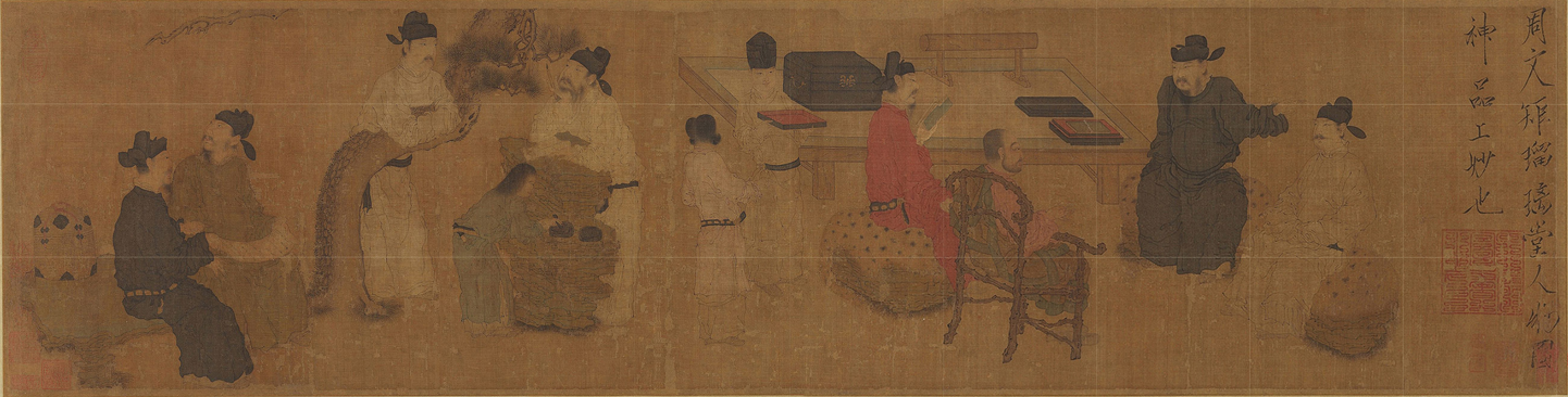 此幅《琉璃堂人物圖》為五代南唐周文矩同名作品的宋摹本。畫面明朗蘊藉,雋潔秀逸,以精妙的筆墨,描繪了諸位文士對坐清談、馳文騁采的情狀,再現了昔日琉璃堂中墨客騷人清談論道、妙筆生花的風采。